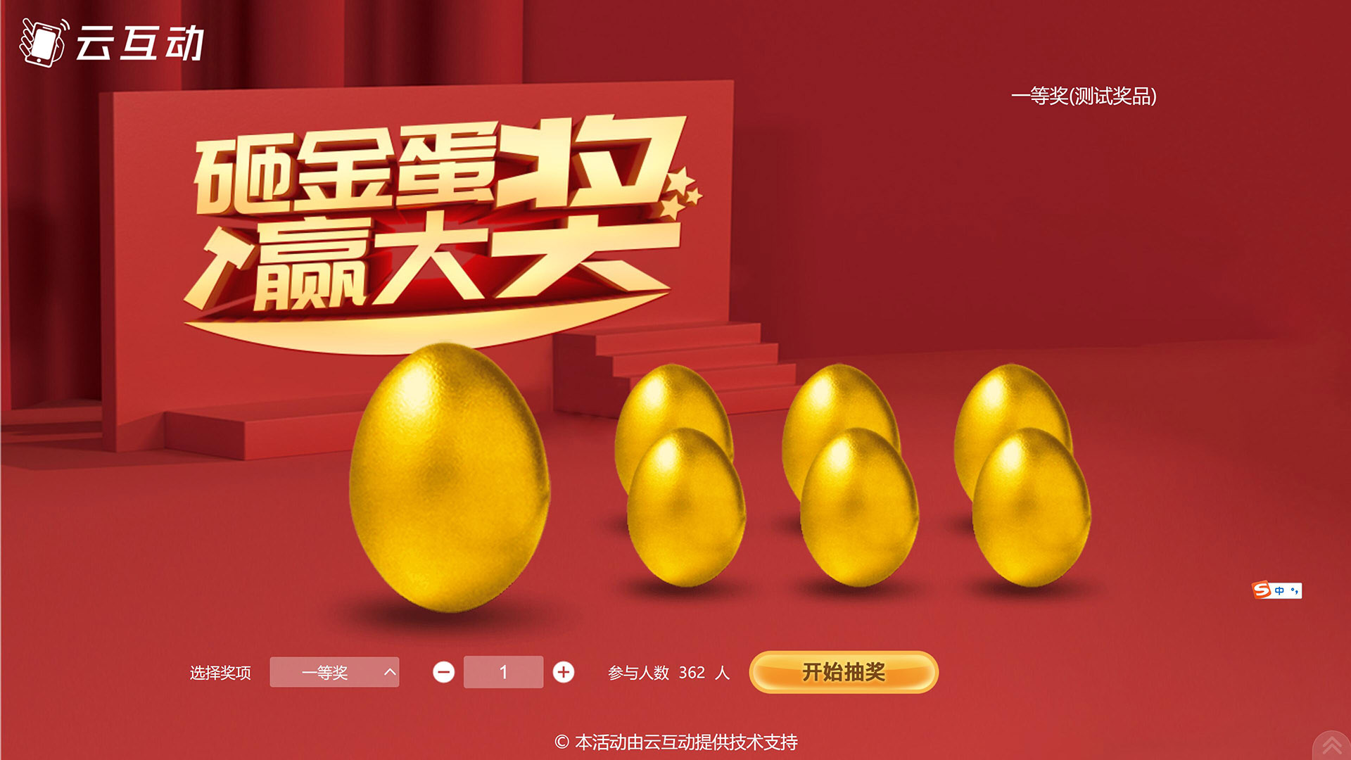 砸金蛋抽奖是喀什云互动系统抽奖功能中可以在现场大屏幕上模拟传统砸金蛋抽奖的应用。可以省去准备金蛋实物等诸多环节。