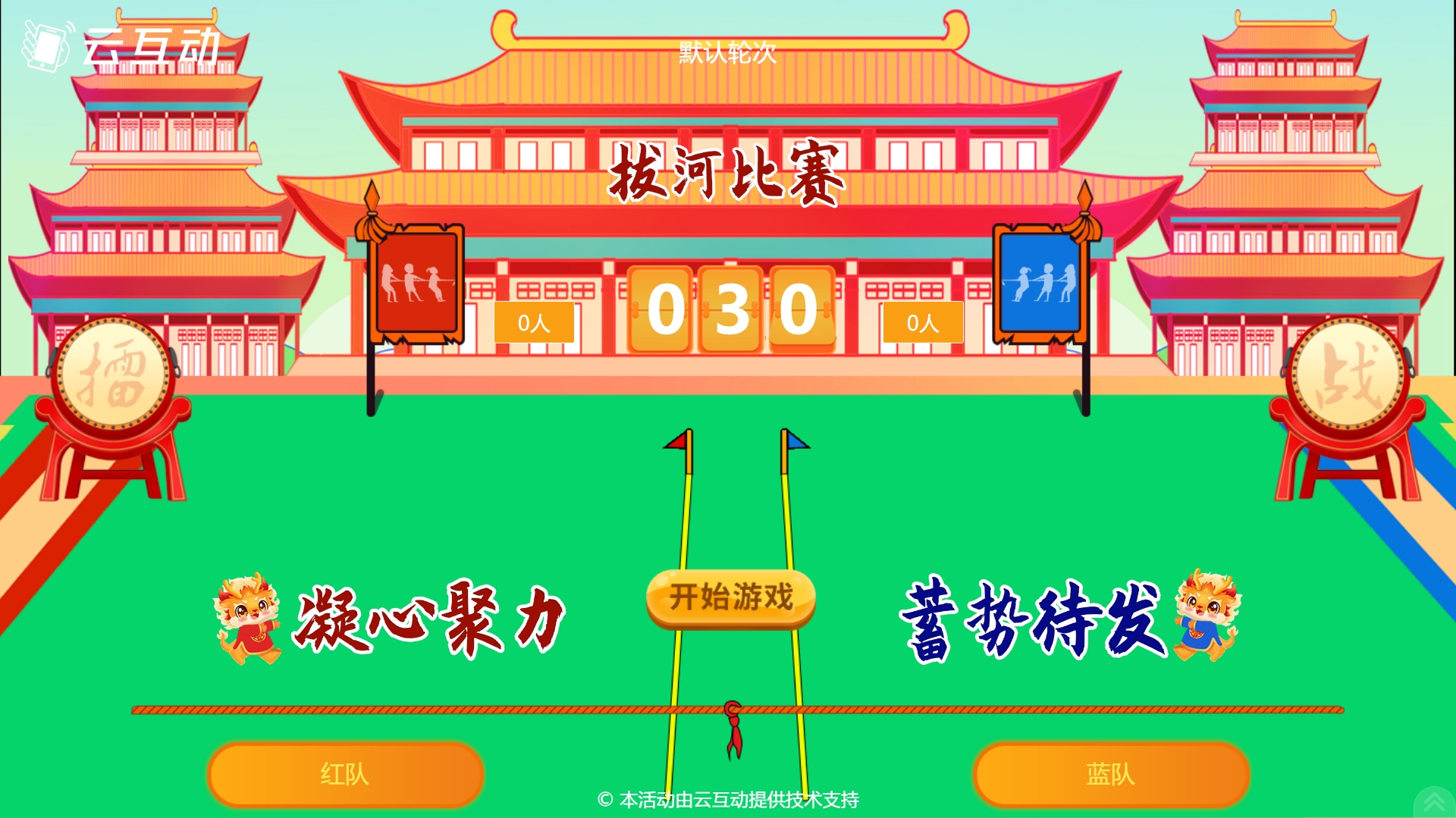 团队拔河互动游戏是喀什云互动系统中基于现场LED大屏幕展示的团队竞技类互动游戏,现场参与用户扫码后可以选择要加入的队伍,待游戏开始后用户摇动手机即可为所在队伍助力,摇动手机次数多的队伍获胜。