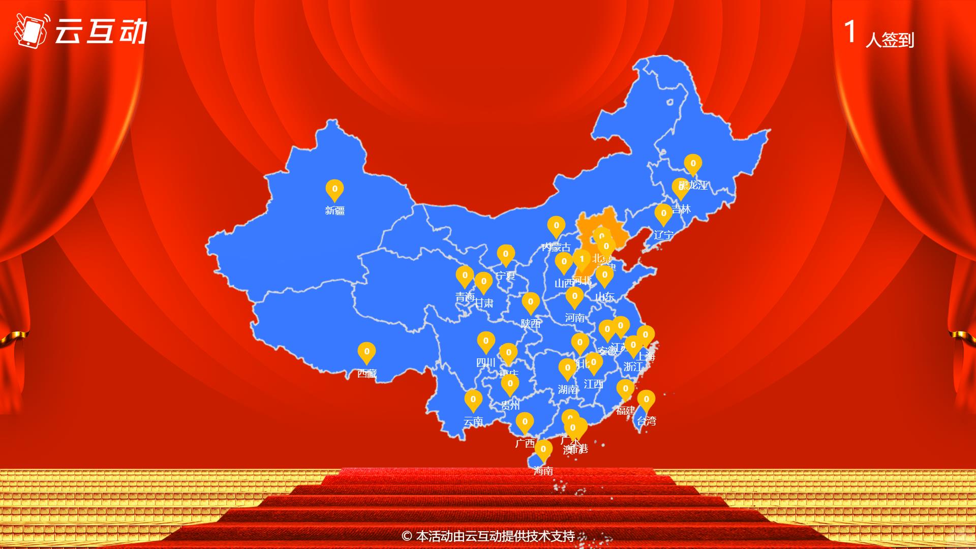 点亮地图签到功能是可以让现场用户扫码后选择自己所在的区域完成签到后,在大屏幕上可以点亮对应的区域,并弹出欢迎弹窗的功能,非常适合集团公司年会、同学会等有多地区用户参与的现场活动签到使用,让签到更加有仪式感和参与感。